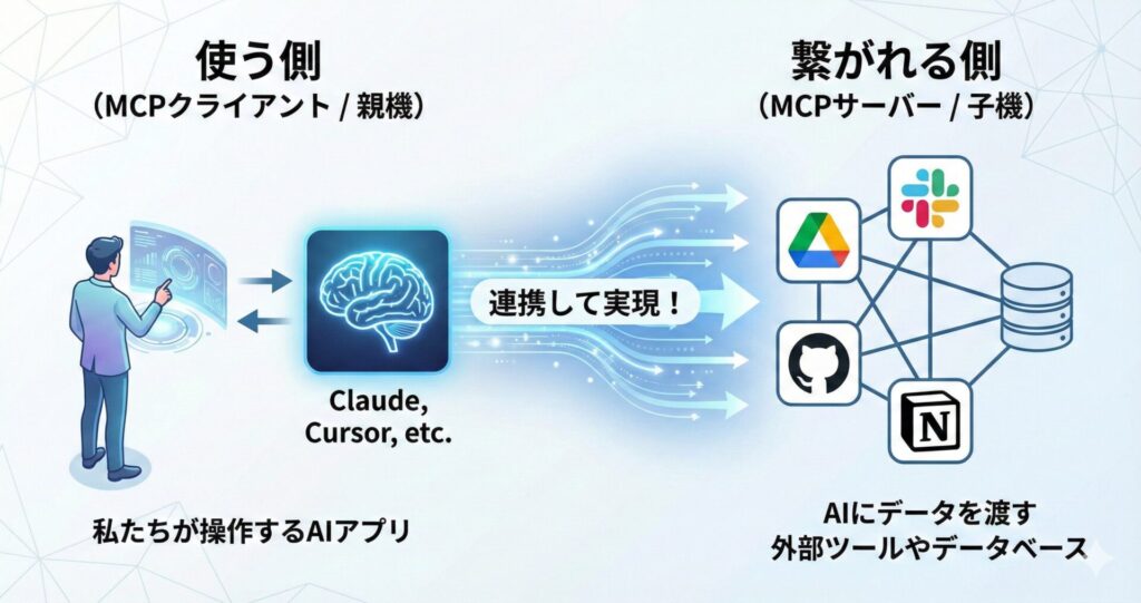 - MCPクライアント(親機): 私たちが操作するAIアプリ。