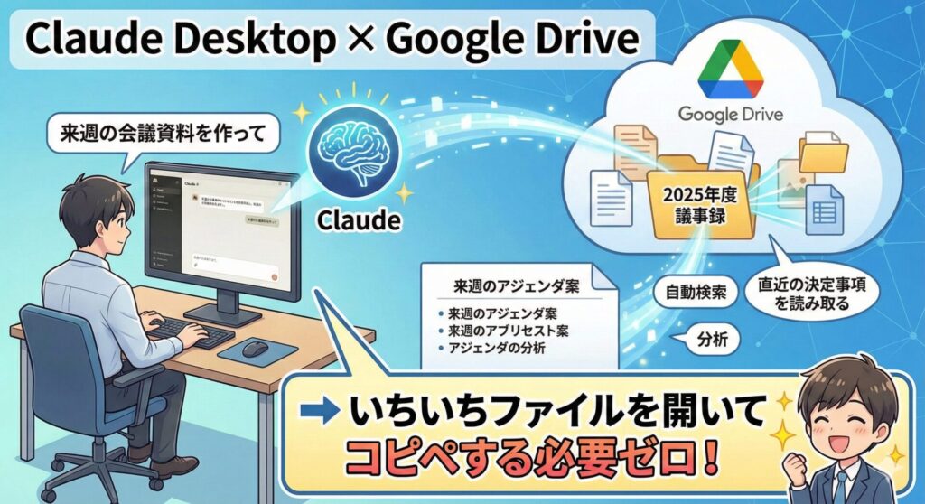 - Claudeが勝手にGoogle Drive内の「2025年度 議事録」フォルダを検索。