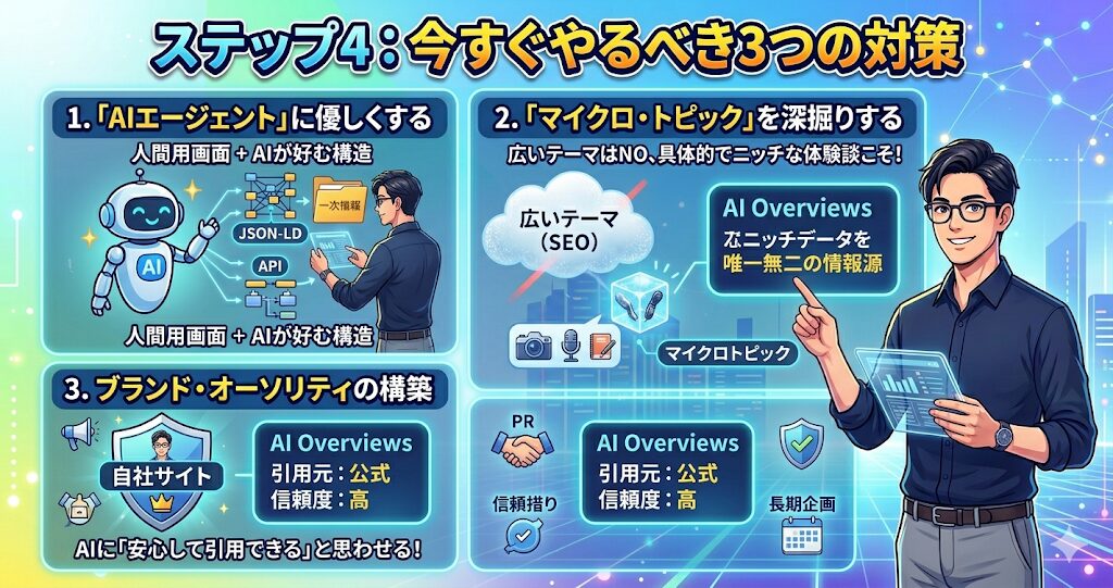人間が見る画面だけでなく、AIが情報を一括取得しやすい構造(API的なデータ提供や、高度な構造化データ「JSON-LD」の最適化)を徹底しましょう。 - 「マイクロ・トピック」を深掘りする: