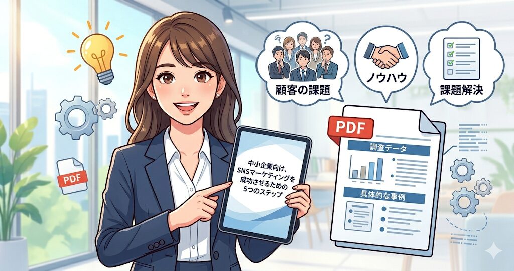 企業の製品やサービスについて、顧客が抱える課題を解決するためのノウハウや調査データ、具体的な事例などをまとめたものを指します。