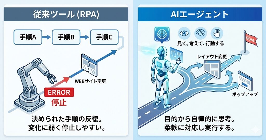 これまでの自動化ツール(RPAなど)は、「AをクリックしてBをコピーする」といった、あらかじめ決められた手順を正確に繰り返すことが得意でした。しかし、Webサイトのデザインが変わったり、想定外のポップアップが出たりすると、すぐに停止してしまう弱点がありました。