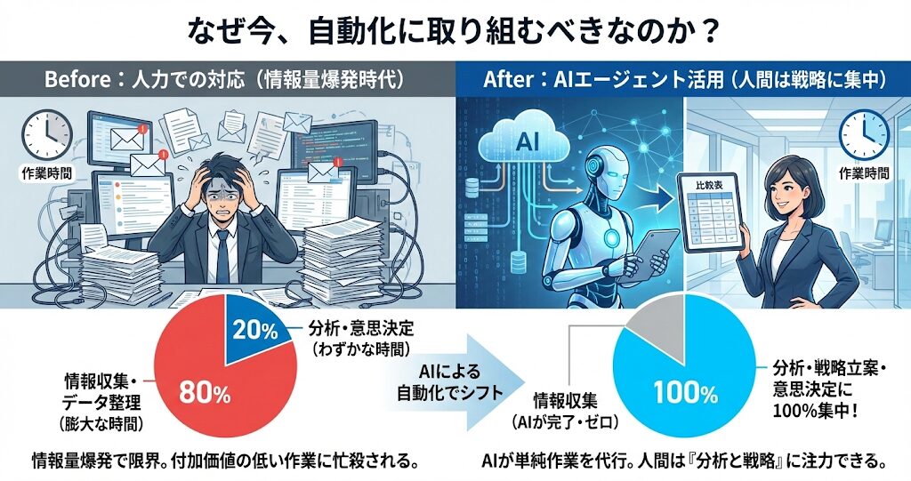そんな悩みを解決するのが、近年急速に進化している「AIエージェント」です。今回は、最も工数がかかり、かつ付加価値の低い「単純な情報収集作業」をAIに任せ、人間が本来やるべき「分析と戦略立案」に集中するための方法について解説します。