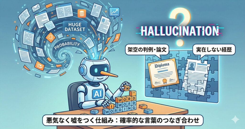 生成AIが事実とは異なる情報を、さも事実であるかのように生成する現象を「ハルシネーション(幻覚)」と呼びます。