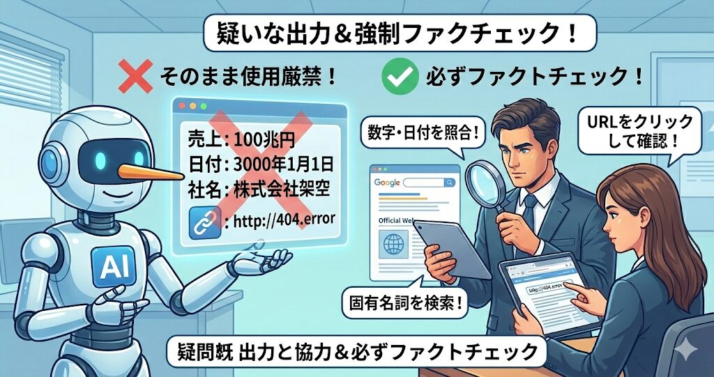 必ず「ファクトチェック(事実確認)」を業務プロセスに組み込んでください。