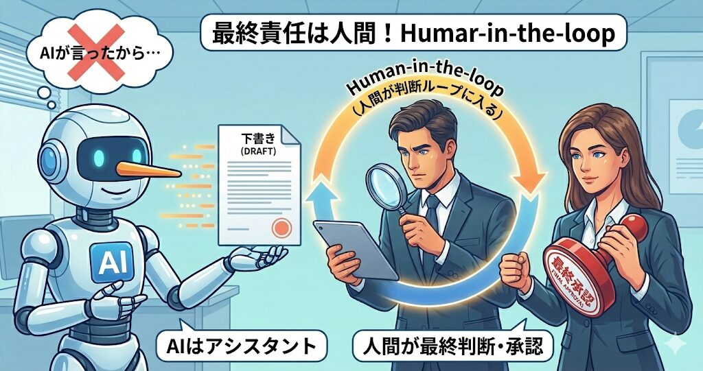 AIはあくまで「下書きを作成するアシスタント」であり、承認印を押すのは必ず人間の役割と定めておく必要があります。