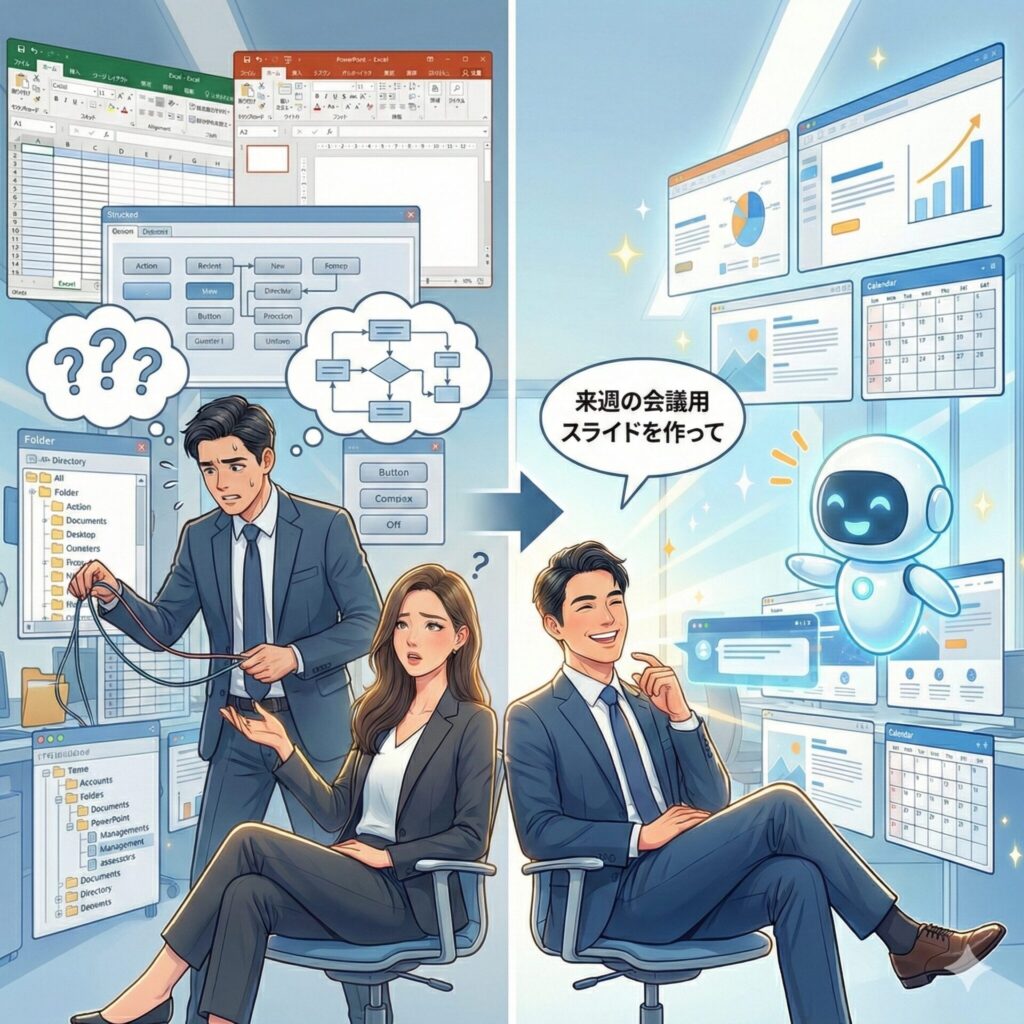 例えば、「来週の会議用のスライドを作って」と頼むだけで、AIが目的を理解し、適切なデザインと構成で資料を完成させる。