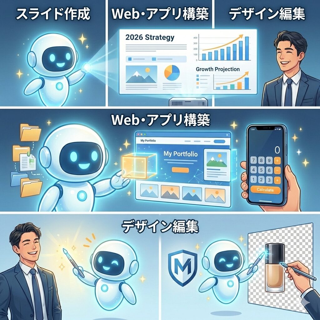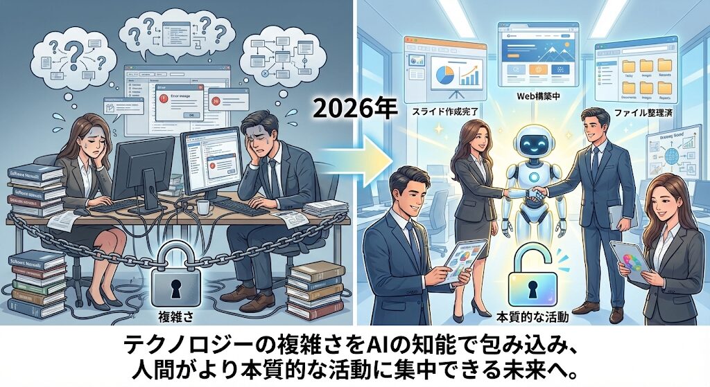 2026年には、AIは単なる「検索や相談の相手」を超え、スライド作成やWeb構築、ファイル整理といった実作業をこなす頼もしいパートナーになっているでしょう。