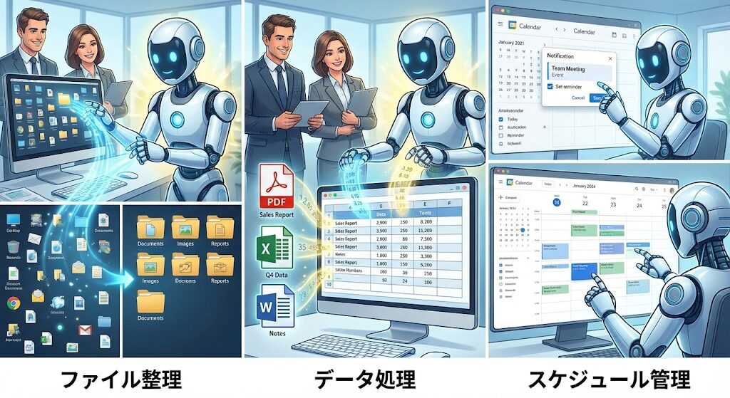 • ファイル整理:「デスクトップの資料を整理して」と言えば、内容を判断して適切なファイル名にリネームし、整理してくれる。