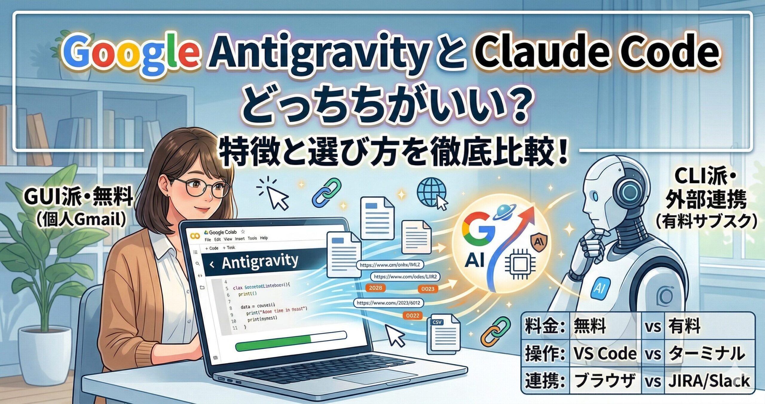 結論から言うと、「視覚的な操作(GUI)が好きで、無料で始めたいならAntigravity」、「ターミナル操作(CLI)が得意で、外部ツール連携や自動化を極めたいならClaude Code」がおすすめです。