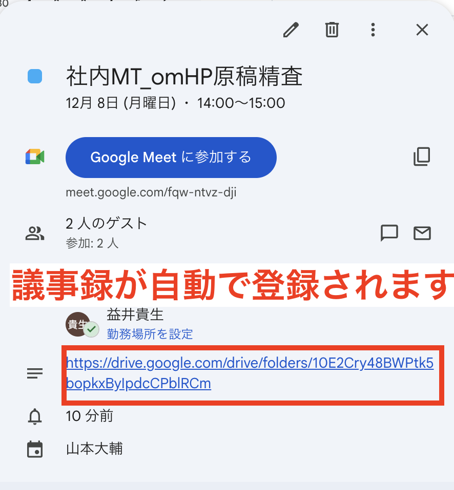 - カレンダー完全連動: 会議終了後、生成された議事録ドキュメントがGoogleカレンダーの予定に自動添付されます。