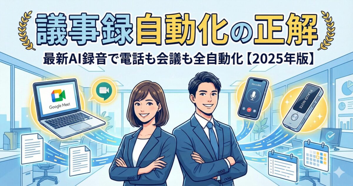 現在の技術では、オンライン会議なら機材不要で完全自動化が可能であり、対面会議や電話でも専用デバイス一つで劇的に効率化できます。