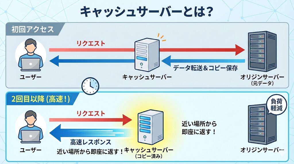 オリジンサーバー(元データがあるサーバー)にあるコンテンツのコピーを一時的に保持するサーバーです。