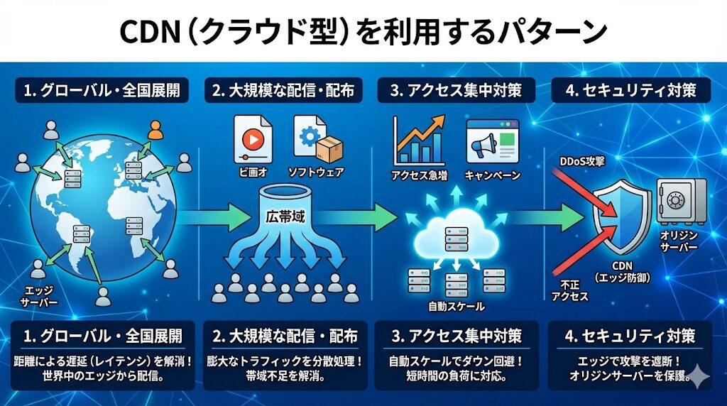 広範囲への配信」「突発的なアクセス対策」が必要な場合に必須となります。