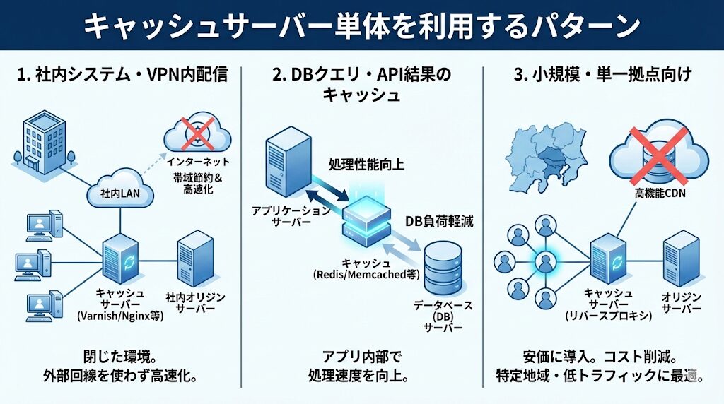 ユーザーが特定の地域(例:関東圏のみ)に集中しており、かつトラフィックがそれほど多くない場合、高機能なCDNを契約するよりも、オリジンサーバーの前に1台キャッシュサーバー(リバースプロキシ)を置く方が安価で済むことがあります。