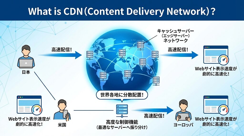 利用者に最も近い場所にあるキャッシュサーバー(エッジサーバー)からコンテンツを届けることで、Webサイトの表示速度を劇的に高速化します。