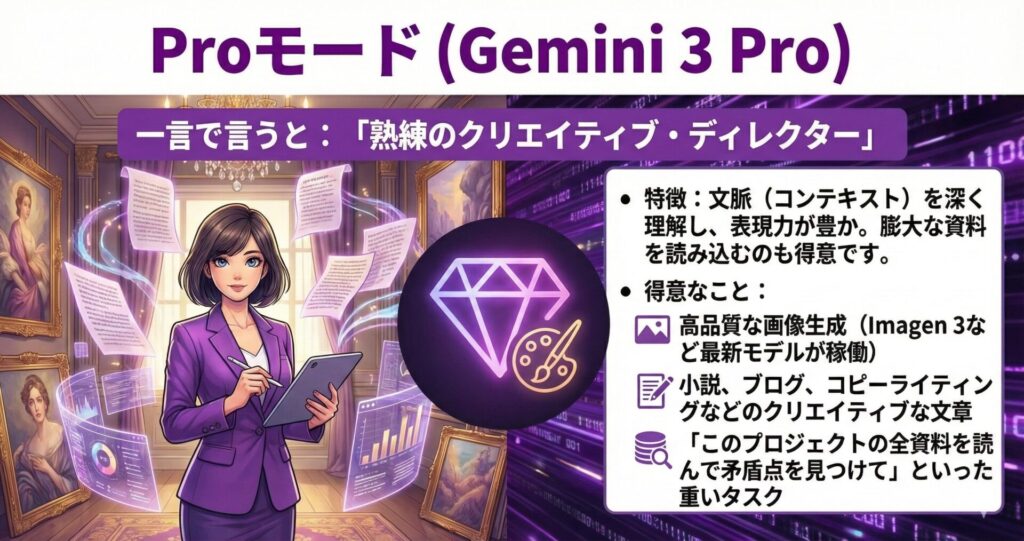 - Proモードを一言で言うと: 「熟練のクリエイティブ・ディレクター」