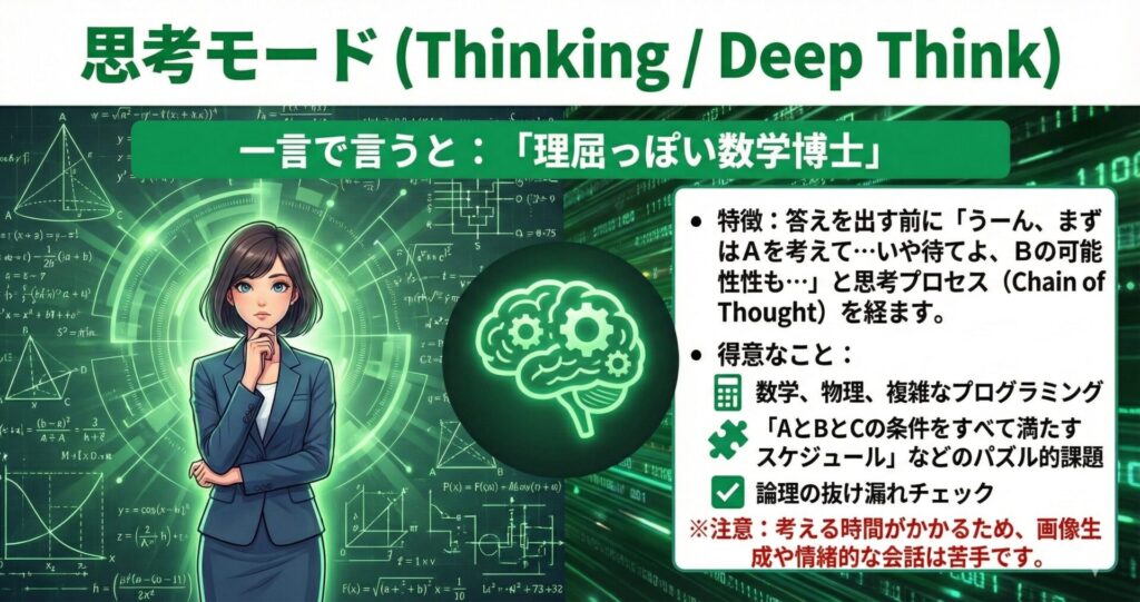 - 「これ計算合ってる?」「コードが動かない!」と困ったら 「思考モード」 に相談。