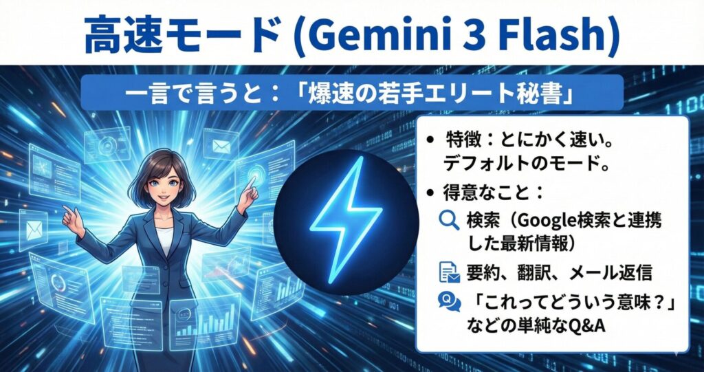 - 高速モードを一言で言うと: 「爆速の若手エリート秘書」