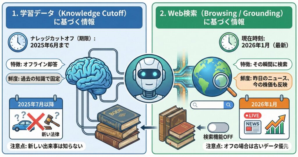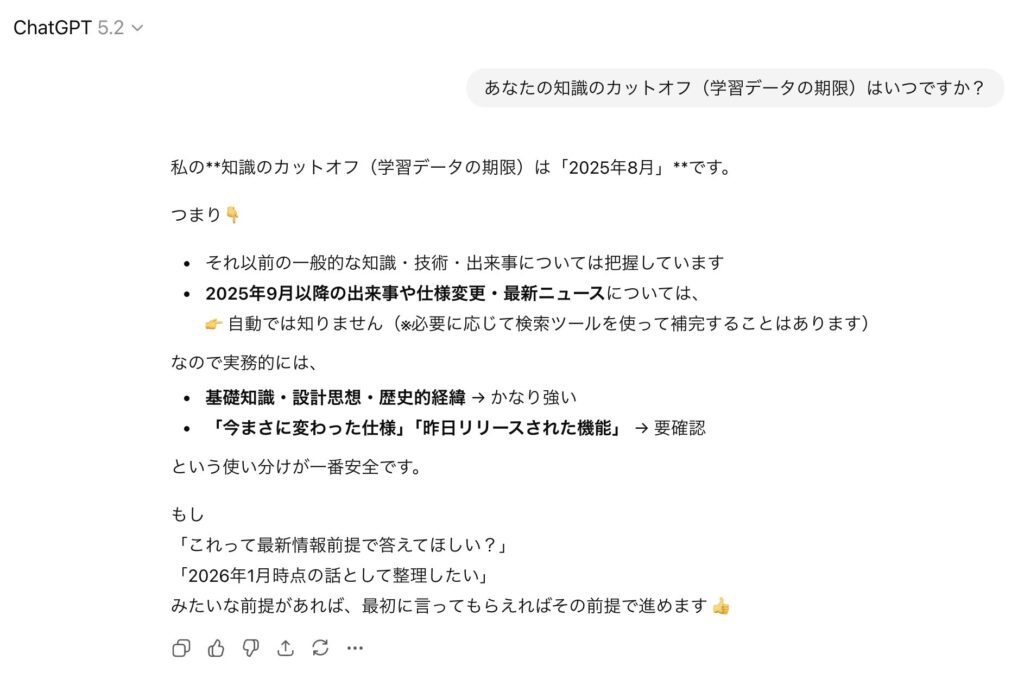 - 注意点: 2026年1月時点で使用しているモデルが、もし「2025年6月までのデータ」で学習されていた場合、それ以降に起きた出来事(新しい法律の施行や新製品の発売など)については知りません。