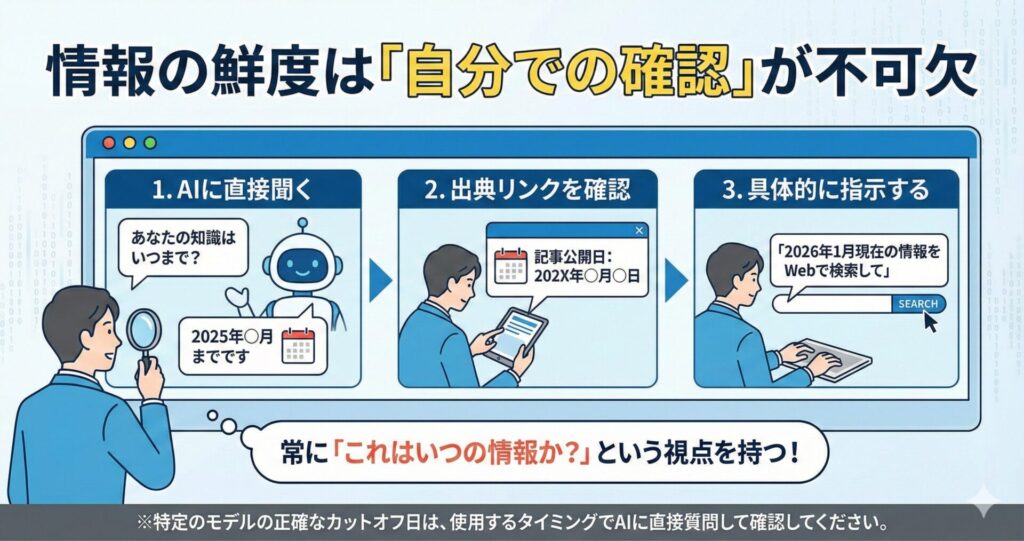 2026年になっても、AIは「過去の学習データ」と「現在のWeb検索」を組み合わせて回答しています。リサーチ情報の時点を厳密に知るためには、以下の行動を徹底してください。