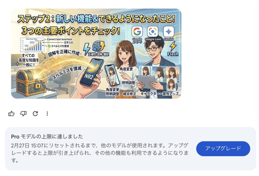 画像生成や複雑な会話をしていて「Proモデルの上限に達しました」と出ても、Geminiが使えなくなるわけではありません。