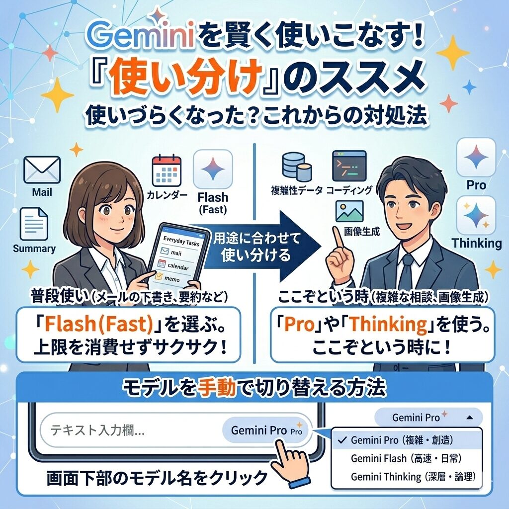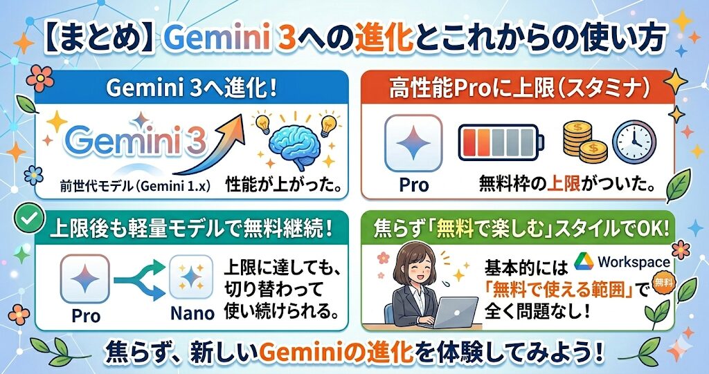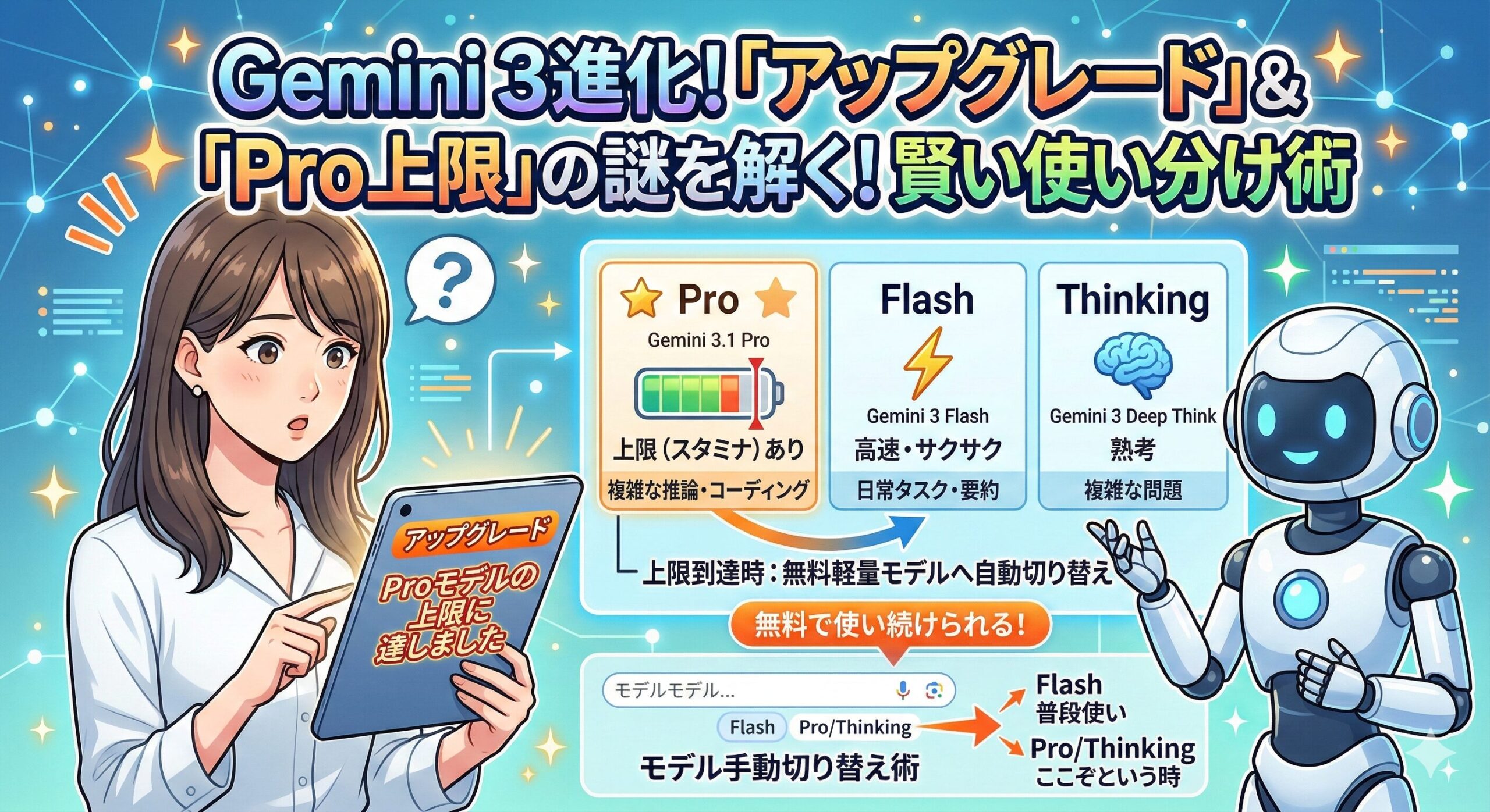 結論から言うと、これはGeminiが最新の「Gemini 3」シリーズへアップデートされたことによる仕様変更です。無料で使い続けることは可能ですが、仕組みが少し変わりました。