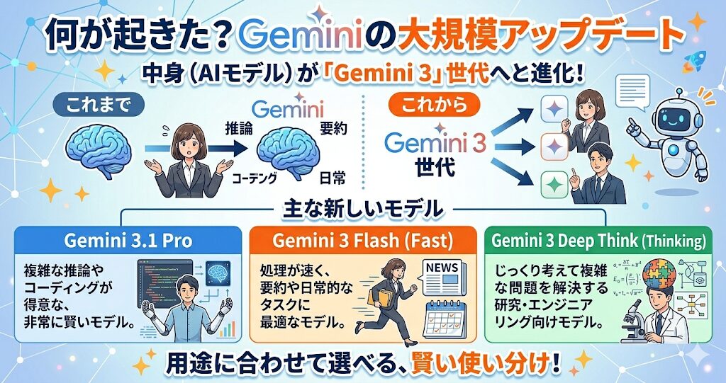 今回の変化の正体は、Geminiの中身(AIモデル)が「Gemini 3」世代へと進化したことにあります。