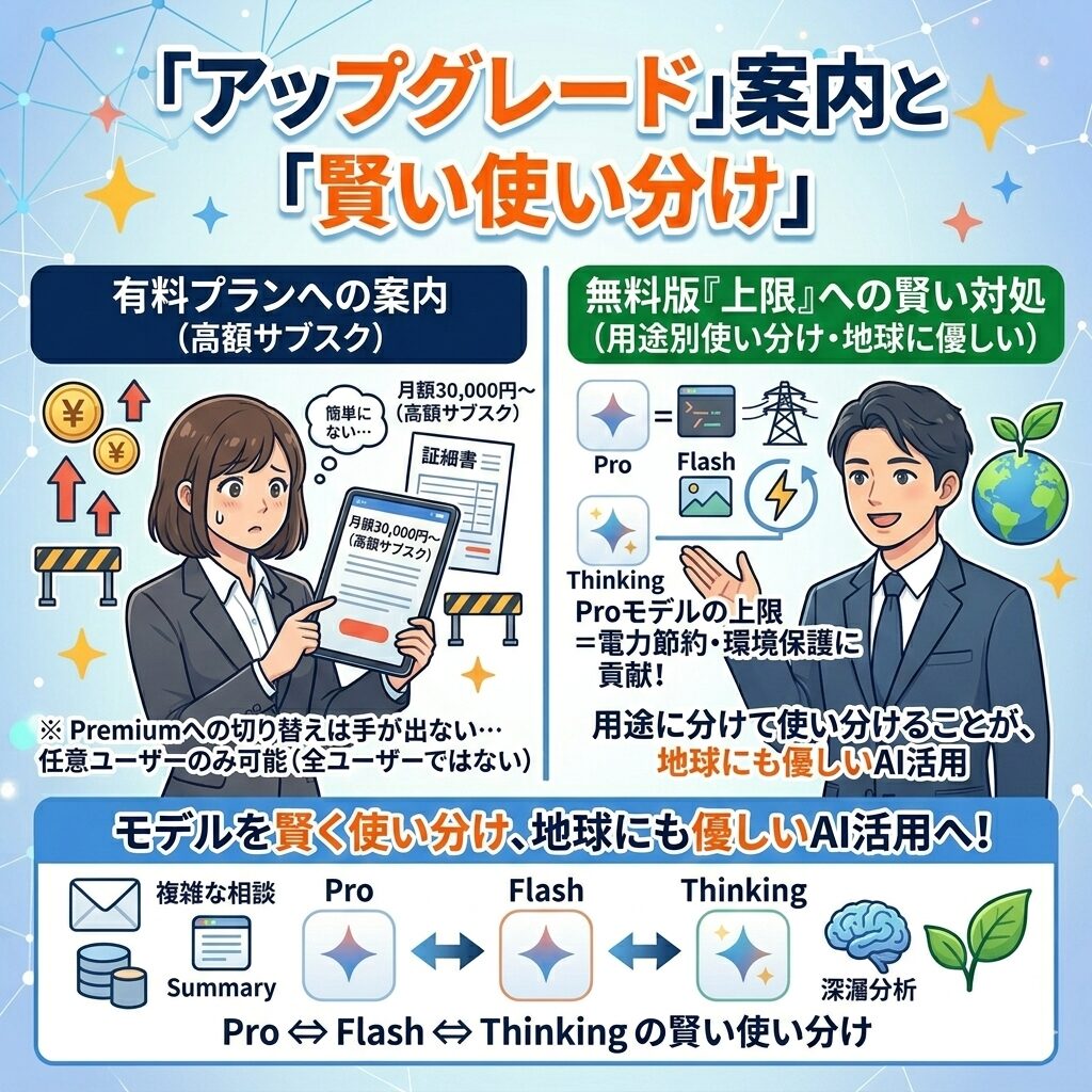 「アップグレードすると上限が引き上げられ…」という表示は、「もしProモデルをもっとたくさん使いたいなら、有料プラン(Google AI Premiumなど)に入ってくださいね」という案内です。