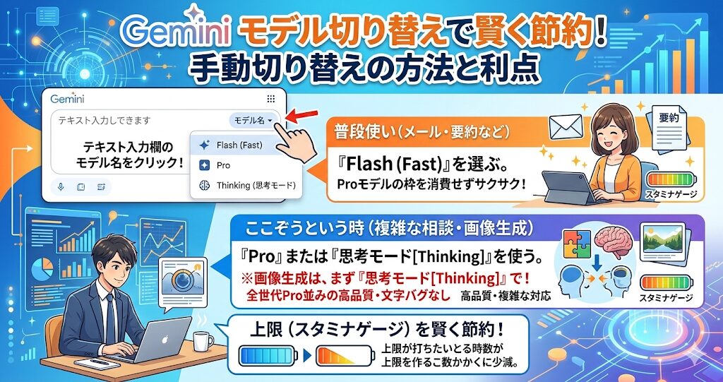 - 普段使い(メールの下書き、要約など):「Flash (Fast)」を選ぶ。これならProモデルの枠を消費せずにサクサク使えます。