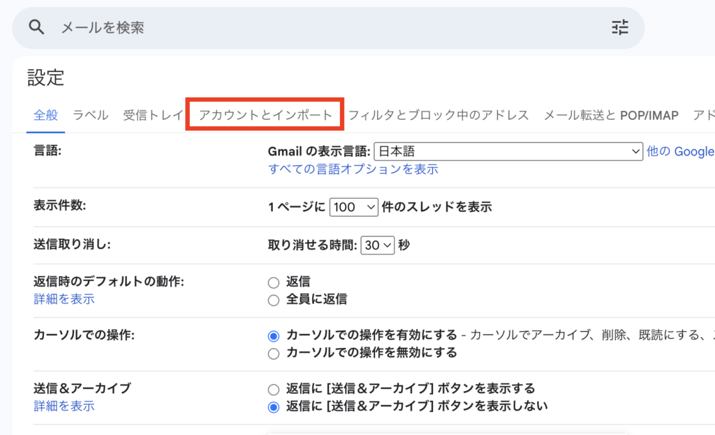 設定画面の上部にあるタブメニューから、「アカウントとインポート」をクリックします。