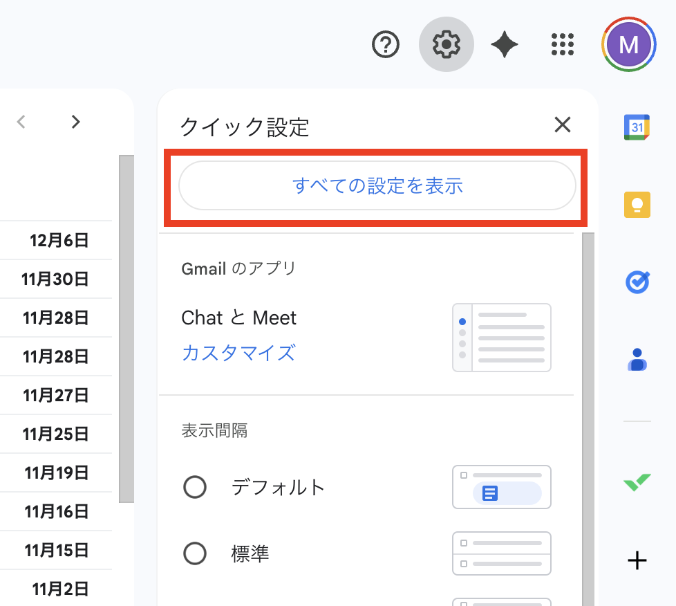 Gmailの画面右上にある歯車アイコン(設定)をクリックし、「すべての設定を表示」ボタンを押します。