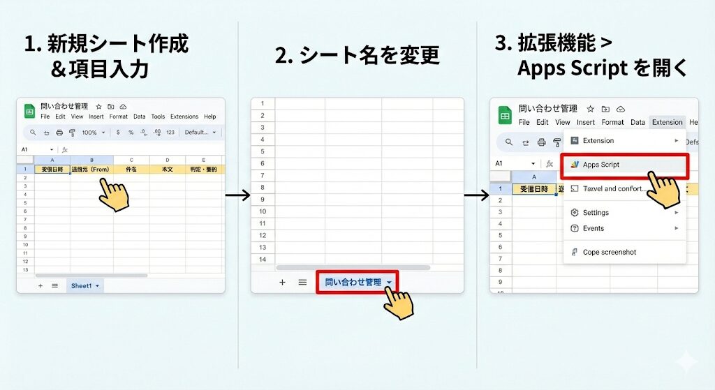 結論から言うと、Gmailで受信した問い合わせメールを「Google Apps Script(GAS)」を使って「Googleスプレッドシート」に自動転送・リスト化するのが最強の解決策です。