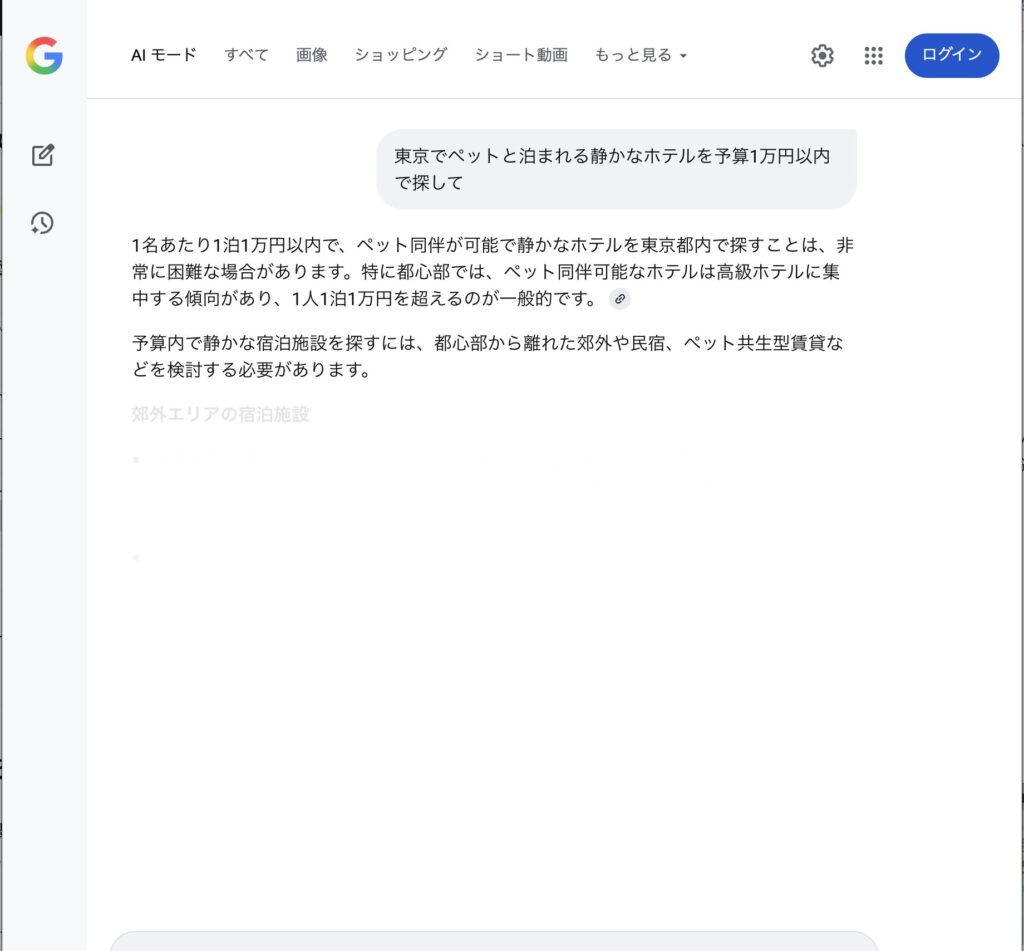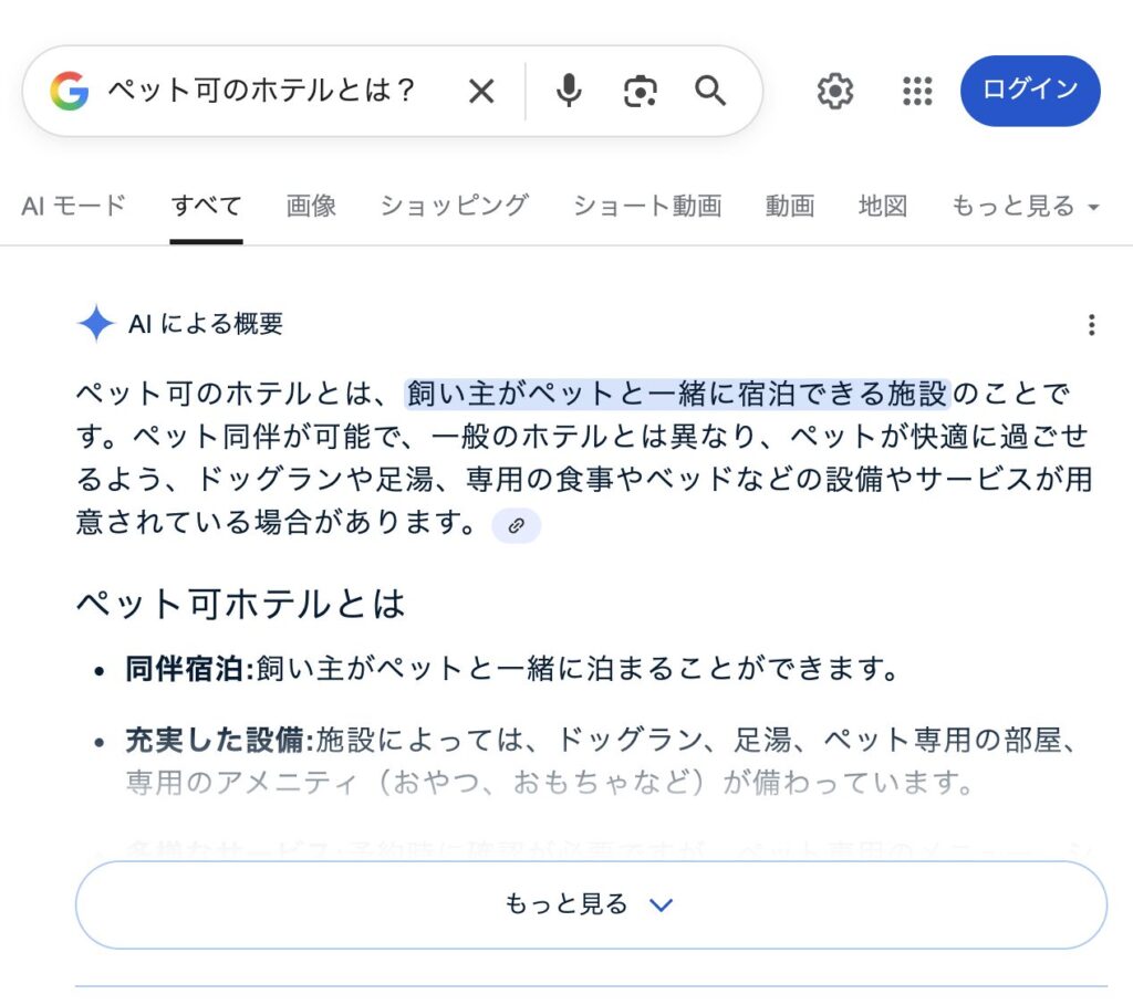 たとえば「ペット可のホテルとは?」という質問にはAIによる概要が基本的な説明を返しますが、「東京でペットと泊まれる静かな