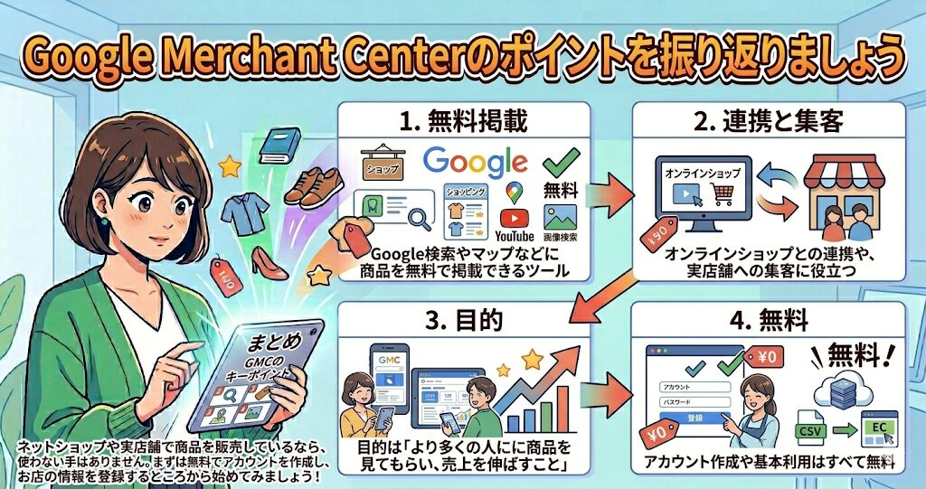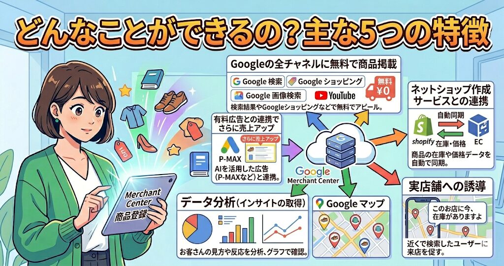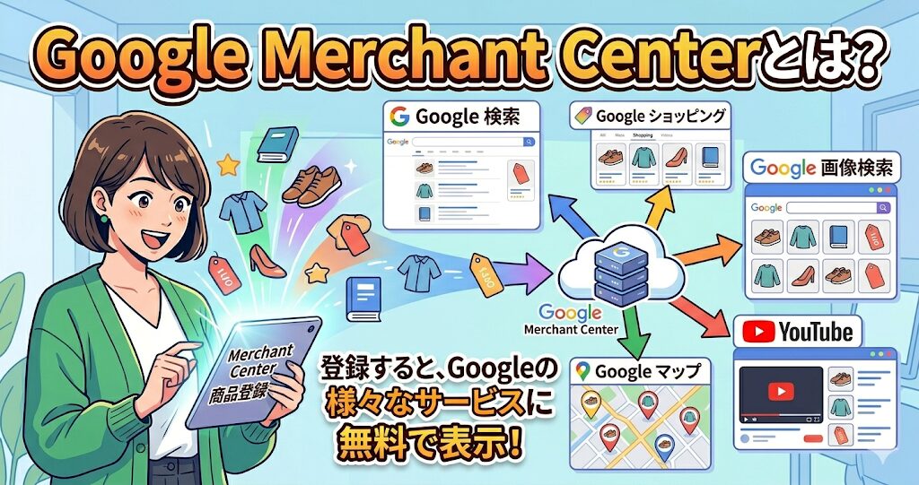 結論から言うと、Google Merchant Centerは「Googleのさまざまな場所に、あなたのお店の情報を無料で掲載できる超便利なツール」です。