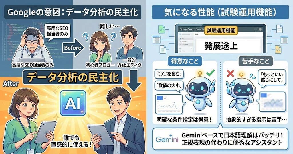 - 自然言語による操作: 複雑な正規表現(Regex)や手動のフィルタリング設定を覚える必要がなく、「過去3ヶ月のモバイルとPCのパフォーマンスを比較して」といった指示を出すだけで、AIが自動的にレポートを構成してくれます。