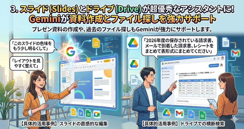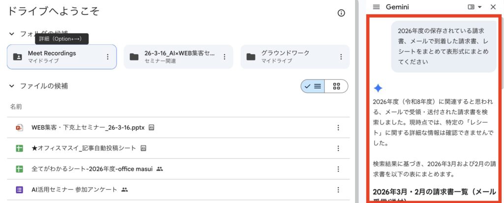 ドライブでの横断検索: Google Driveでは「Ask Gemini in Drive」という機能が追加されました。「2026年度の保存されている請求書、メールで到着した請求書、レシートをまとめて表形式にまとめてください」といった、複数のファイルをまたいだ複雑な質問にも答えてくれる「専用の知識データベース」として機能します。