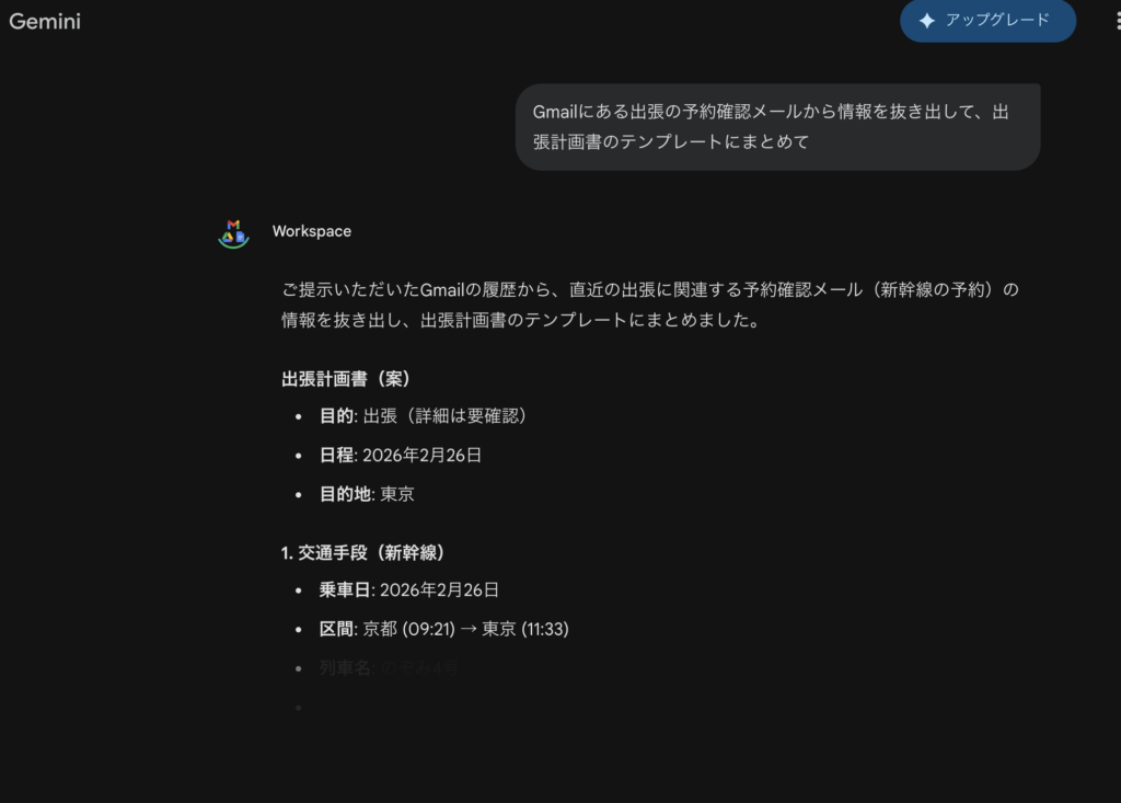 メールからの自動抽出: 例えば「Gmailにある出張の予約確認メールから情報を抜き出して、出張計画書のテンプレートにまとめて」と指示するだけで、フライト情報やホテル予約を自動で挿入したドキュメントが完成します。
