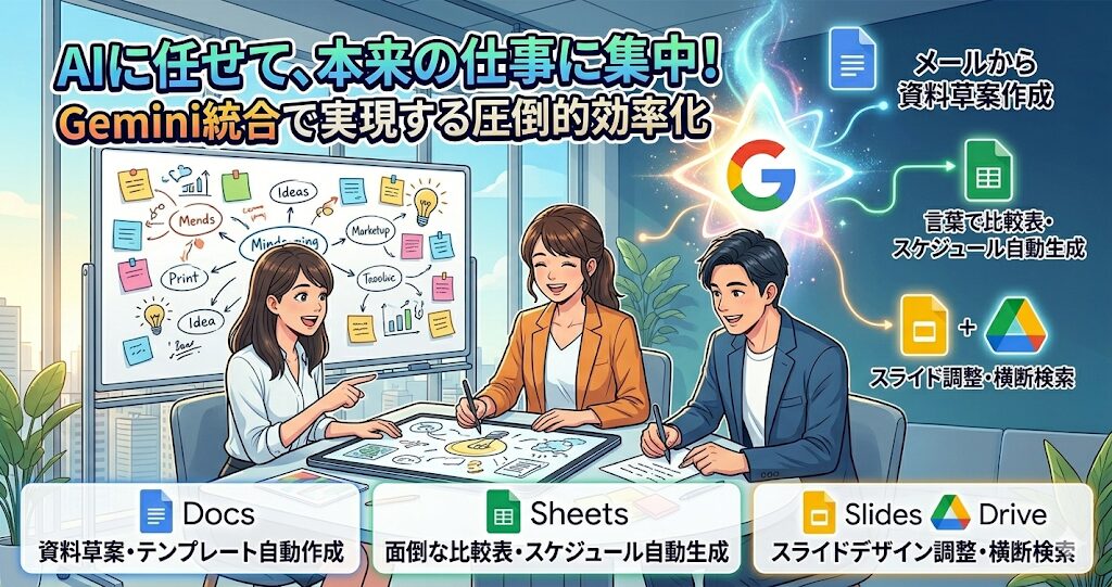 結論から言うと、Docs(ドキュメント)やSheets(スプレッドシート)などの作業が、AIに「〇〇して」と話しかけるだけで自動化され、資料作成やデータ整理の時間が劇的に短縮されます!