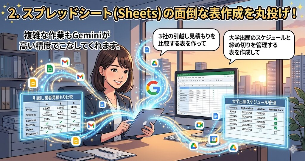 - Sheets: 言葉の指示だけで、面倒な比較表やスケジュール管理表をサクッと自動生成