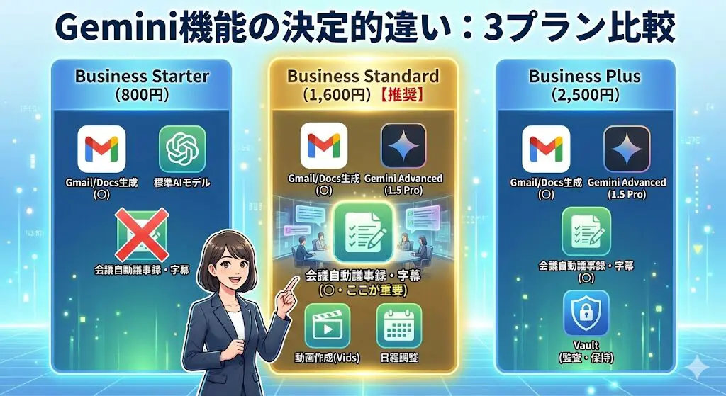 1. 結論:全社員にGeminiを使わせるなら「Business Standard」一択