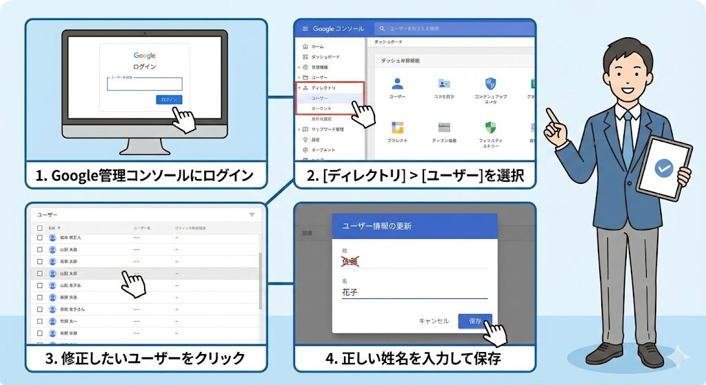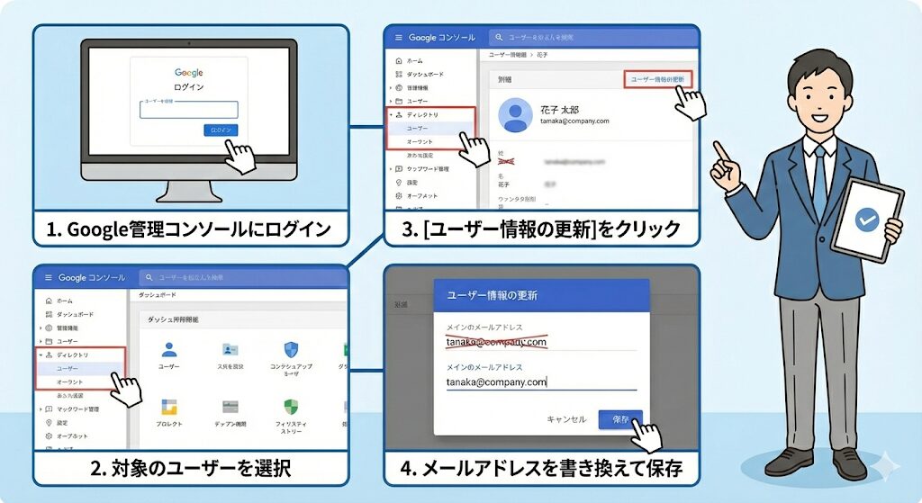 Google Workspaceでは、管理画面から簡単にユーザー名やメールアドレスを修正できます。