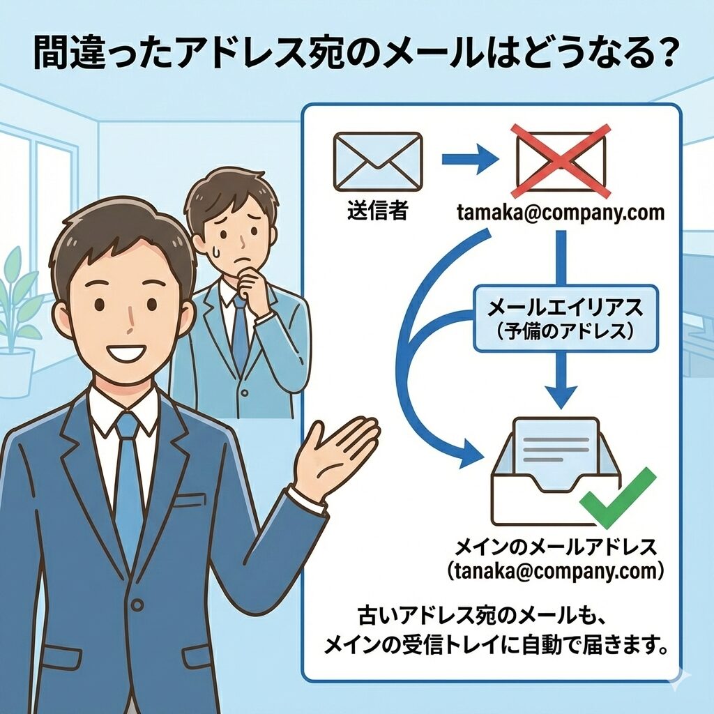 - 間違ったアドレス:自動的に「エイリアス」として残るため、メールの受信漏れは起きない。