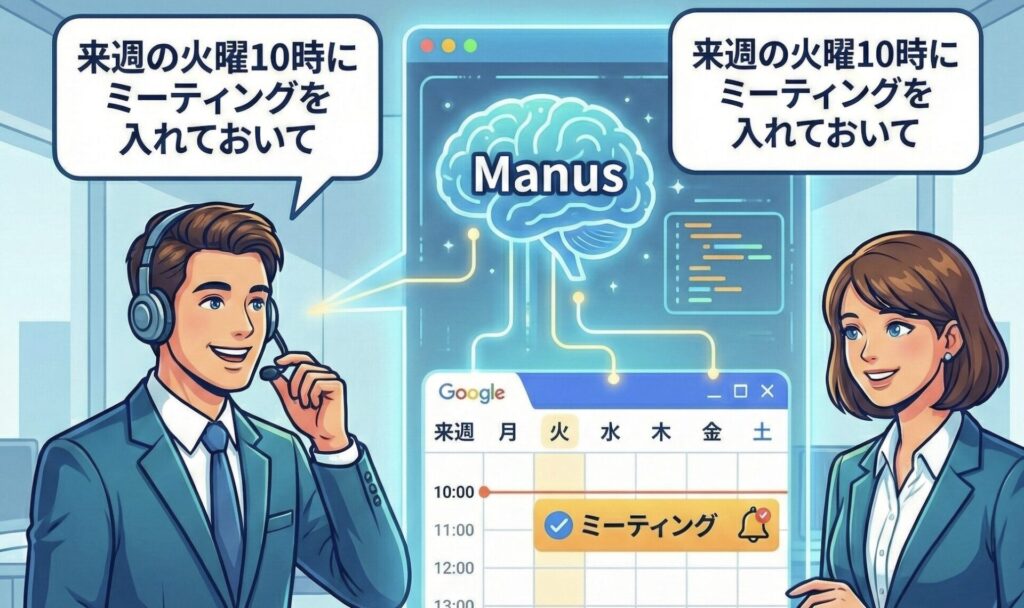 「来週の火曜10時にミーティングを入れておいて」と伝えるだけで、スケジュール調整が完了します。