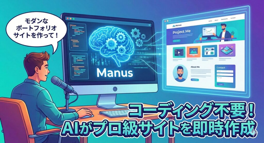 自分の作品集やプロフィールサイトを作りたいとき、Manusに頼めばコードを書く必要はありません。「私のこれまでの経歴を使って、モダンなデザインのポートフォリオサイトを作って」と依頼するだけで、公開可能なレベルのWebサイトを構築してくれます。