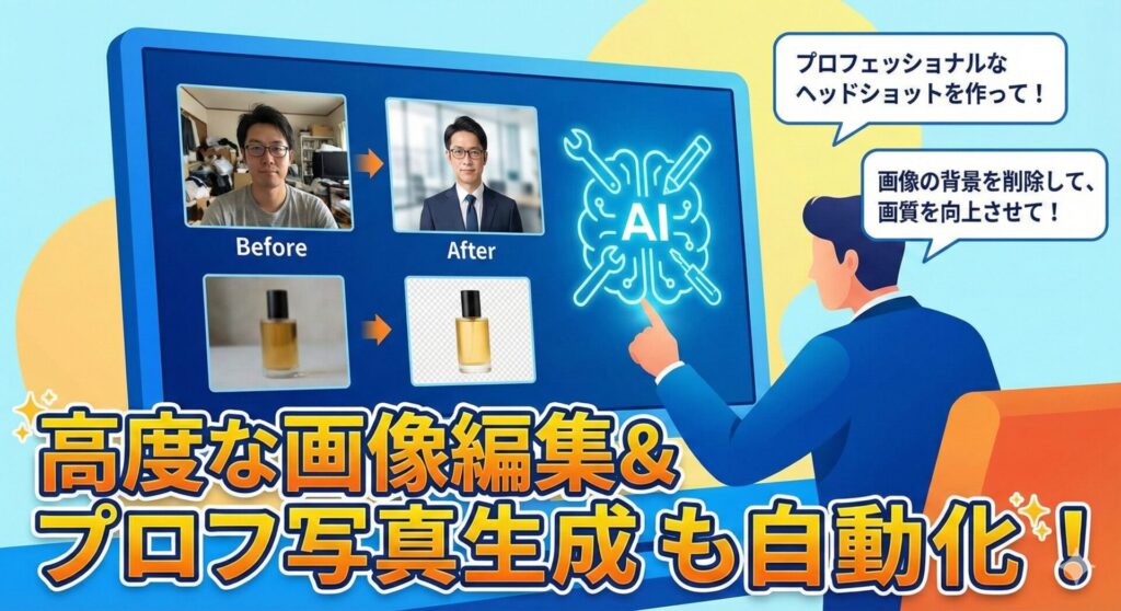 デザイン作業も得意分野です。画像の背景を削除したり、画質を向上させたりといった編集作業を自動化できます。