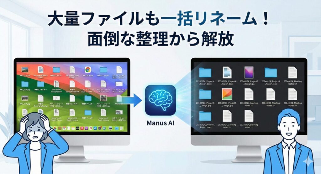パソコンの中に溜まった大量のファイル。「日付_プロジェクト名」のようにルールを決めて整理したいとき、Manusに指示すればルールに基づいた一括リネームを実行してくれます。地味ながらも面倒なファイル管理作業から解放されます。