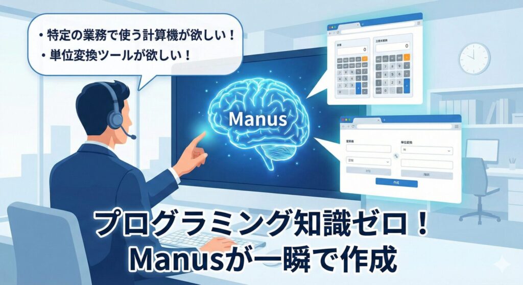 「特定の業務で使う計算機が欲しい」「単位変換ツールが欲しい」といった場合も、Manusなら一瞬です。