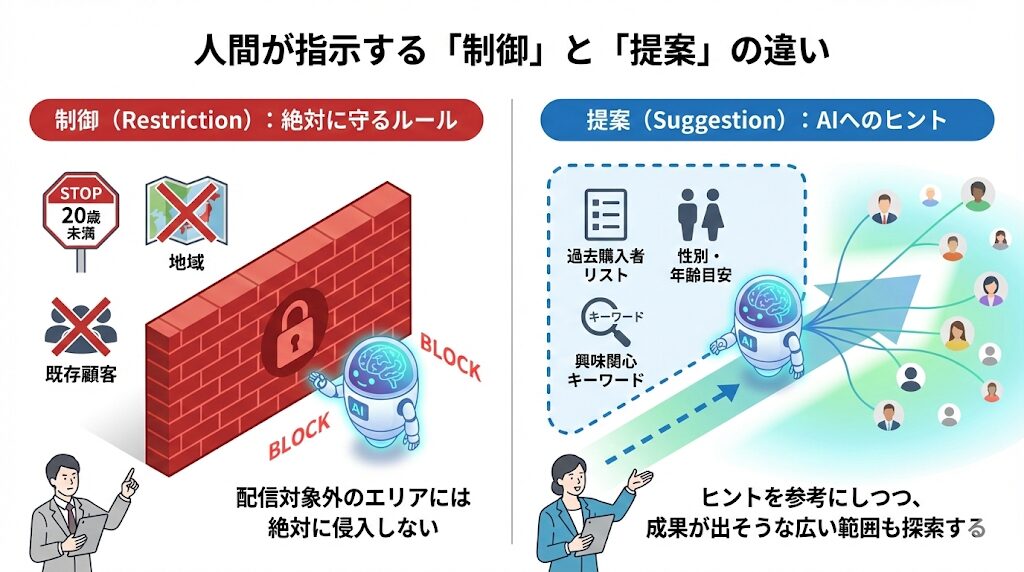 運用者は「制御(Restriction)」と「提案(Suggestion)」という2つの方法でAIに指示を出します。この違いを理解することが重要です。
