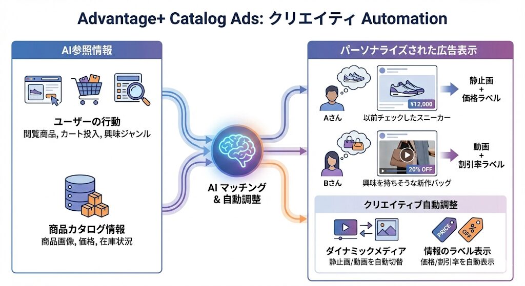 「Advantage+ カタログ広告」(旧:ダイナミック広告)は、ECサイトなどで特に効果を発揮する機能です。ユーザーごとに「表示する商品」や「見せ方」を自動で変える仕組みです。