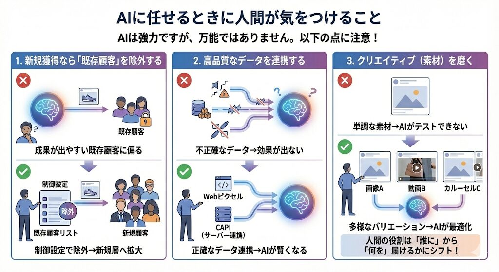 AIの判断材料となるデータが不正確だと、効果が出ません。Webサイトのピクセル設定や、サーバー側でのデータ連携(CAPI)を整備し、正確な購入データをMeta側に送ることが重要です。